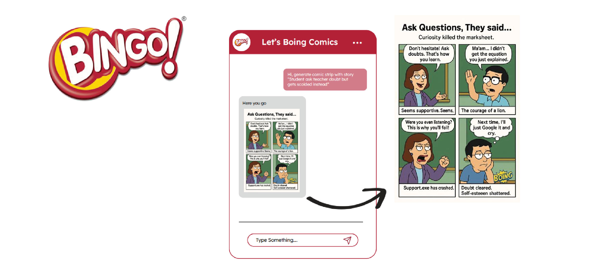 An AI-driven interactive campaign was developed for Bingo Chips, where users entered quirky one-liners into a chat box that instantly converted them into fun 4-panel comic strips. The experience was simple, engaging, and aligned perfectly with Bingo’s playful tone.