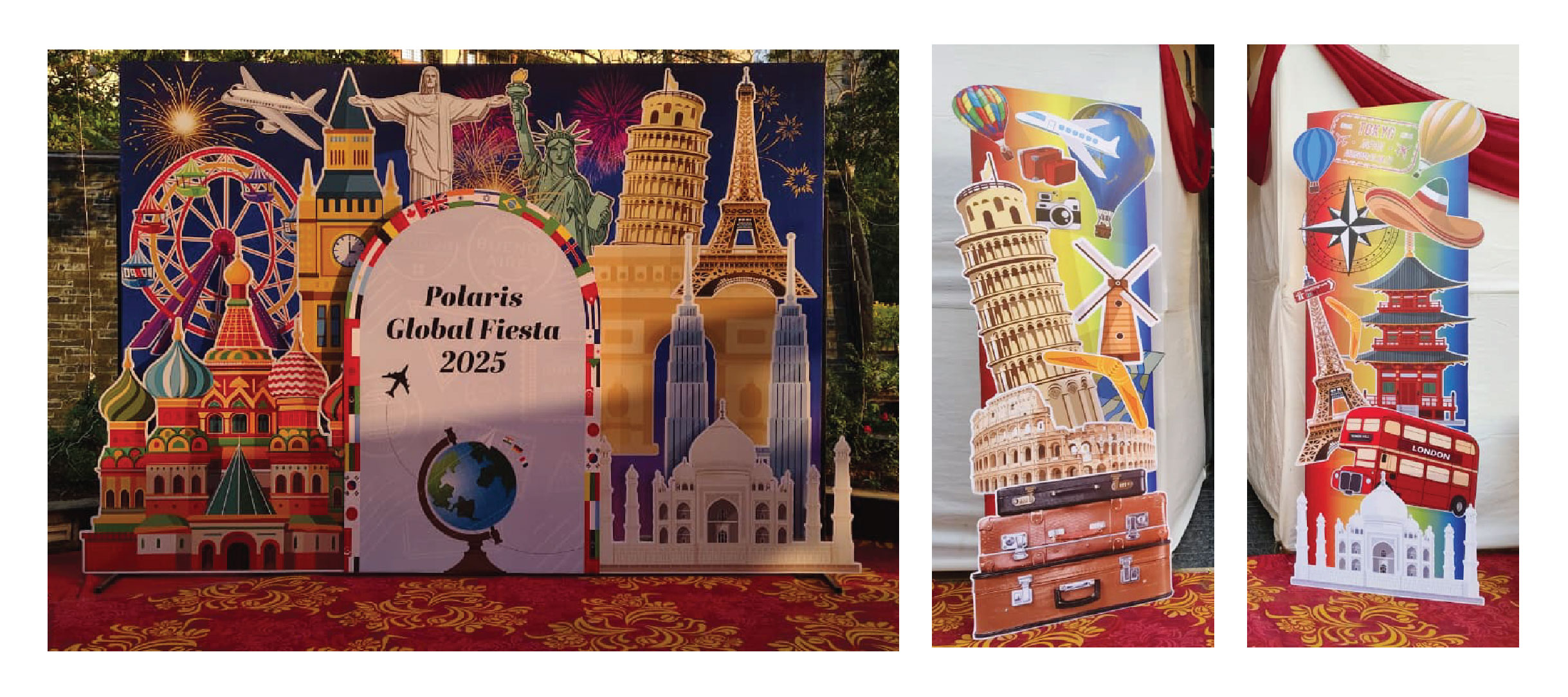 A vibrant and immersive event setup was designed and executed for Polaris Global Fiesta 2025, celebrating global culture, connectivity, and togetherness. The scenic backdrop featured iconic world landmarks—including the Eiffel Tower, Big Ben, Statue of Liberty, Colosseum, and Christ the Redeemer—creatively composed to represent international unity and global reach. The central archway, highlighted with international flags and strong event branding, served as a striking focal point and a perfect photo-op for attendees.